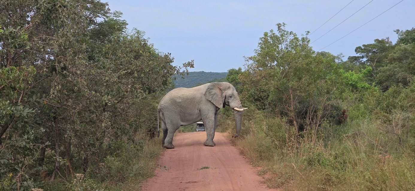 Nyligen på safari i Sydafrika befann vi oss i situationen där elefanten på bilden  blockerade vägen för oss. I över en timme gick han mellan båda sidorna av vägen och drog ner och ryckte upp träd…hela tiden såg han till att delvis befinna sig på vägen så vi inte kunde köra förbi.